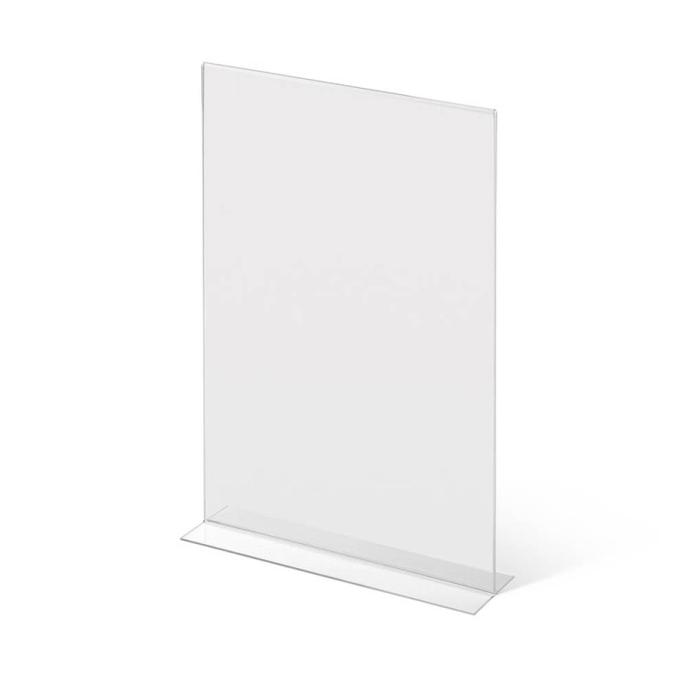 Formschöner Acrylaufsteller in T-Form mit beidseitiger Blatteinlage. Im Hoch- und Querformat in den DIN-Formaten A7 – A3 erhältlich. Sein durchsichtiger Look stellt Ihre Botschaft in den unmittelbaren Vordergrund. Material: glasklares Acryl mit einer Stärke von 1,5 – 2,5 mm, je nach DIN-Format.