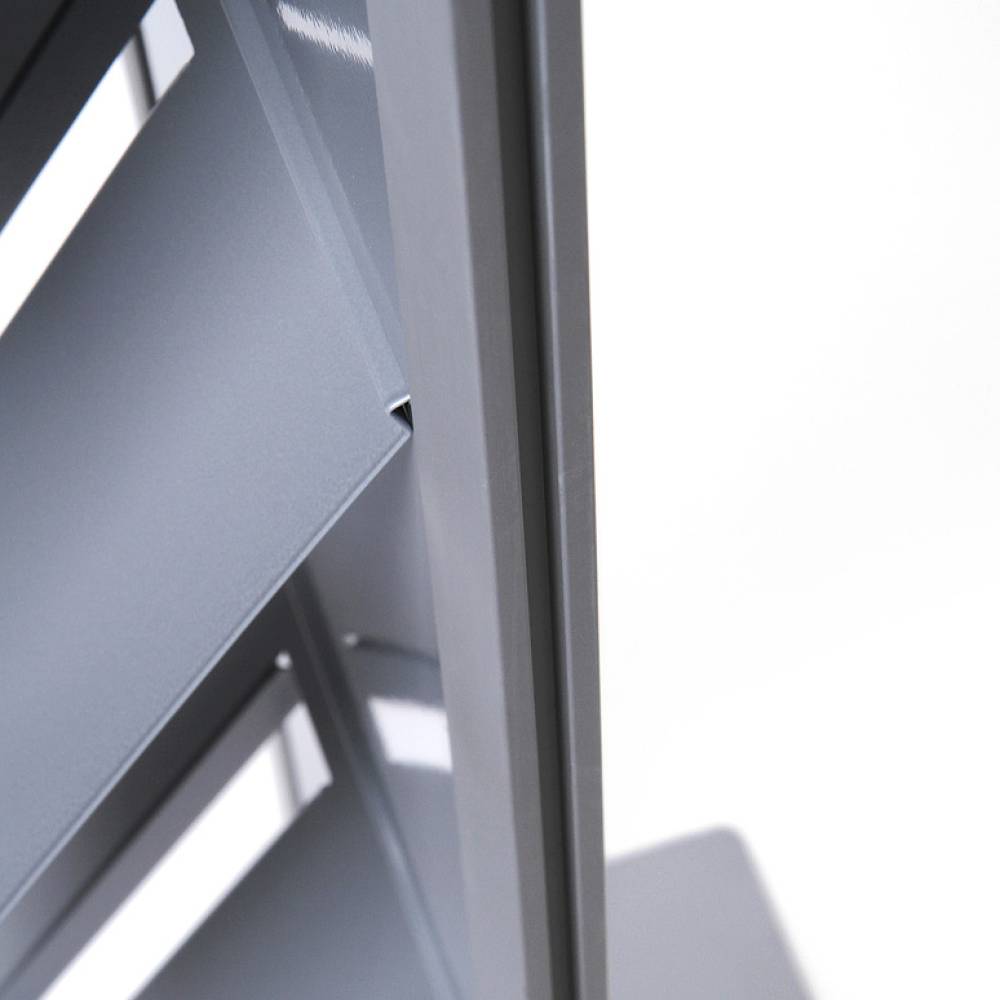 - Elegante Optik – silber eloxierte Aluminiumprofile mit pulverbeschichteter Mittelplatte in grau oder schwarz.