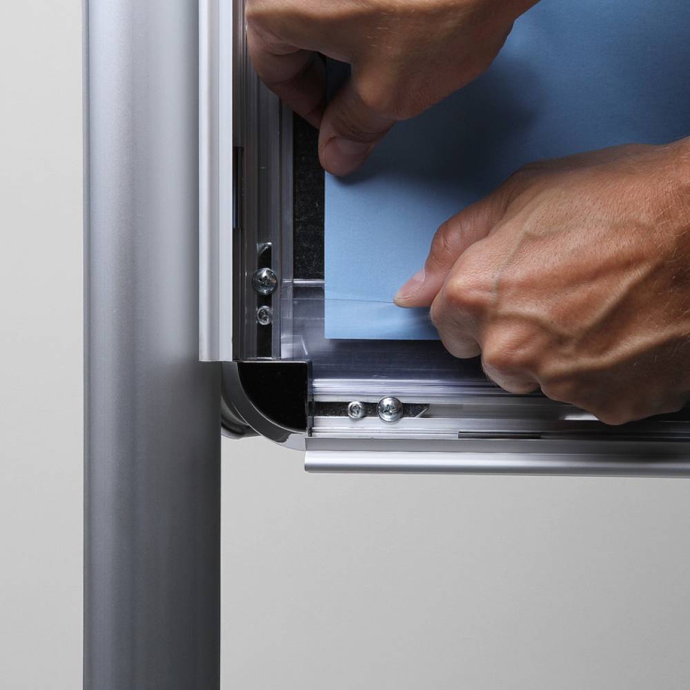 - Dreieckständer (Triboard) mit 3 silber eloxierten, aufmontierbaren 32 mm Aluminium-Klapprahmen.